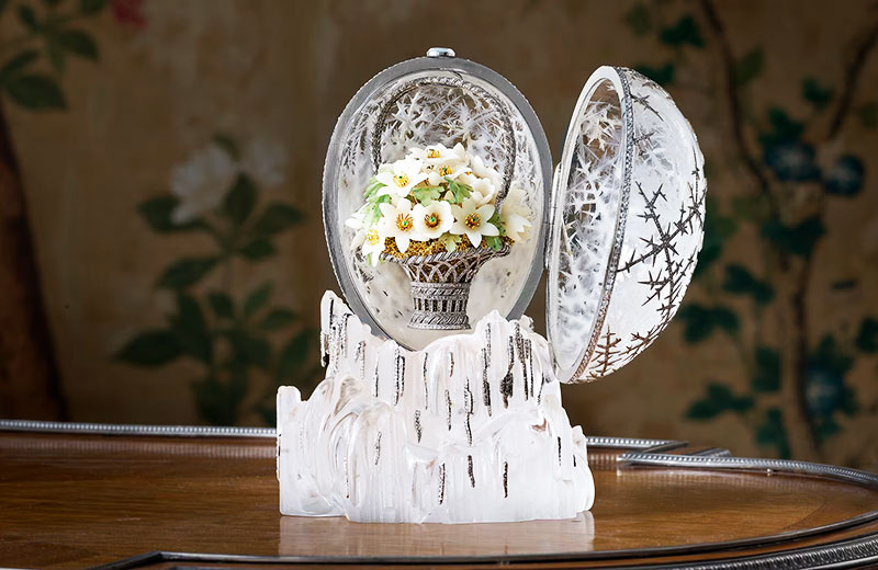 Внутри яйца прячется корзинка с подснежниками, выполненная с ювелирной точностью. Цветы и листья изготовлены из кварца и нефрита, создавая гармоничное сочетание, где лед снаружи переходит в цветочные элементы внутри. Более 3000 мелких алмазов придают этому шедевру удивительное сияние.