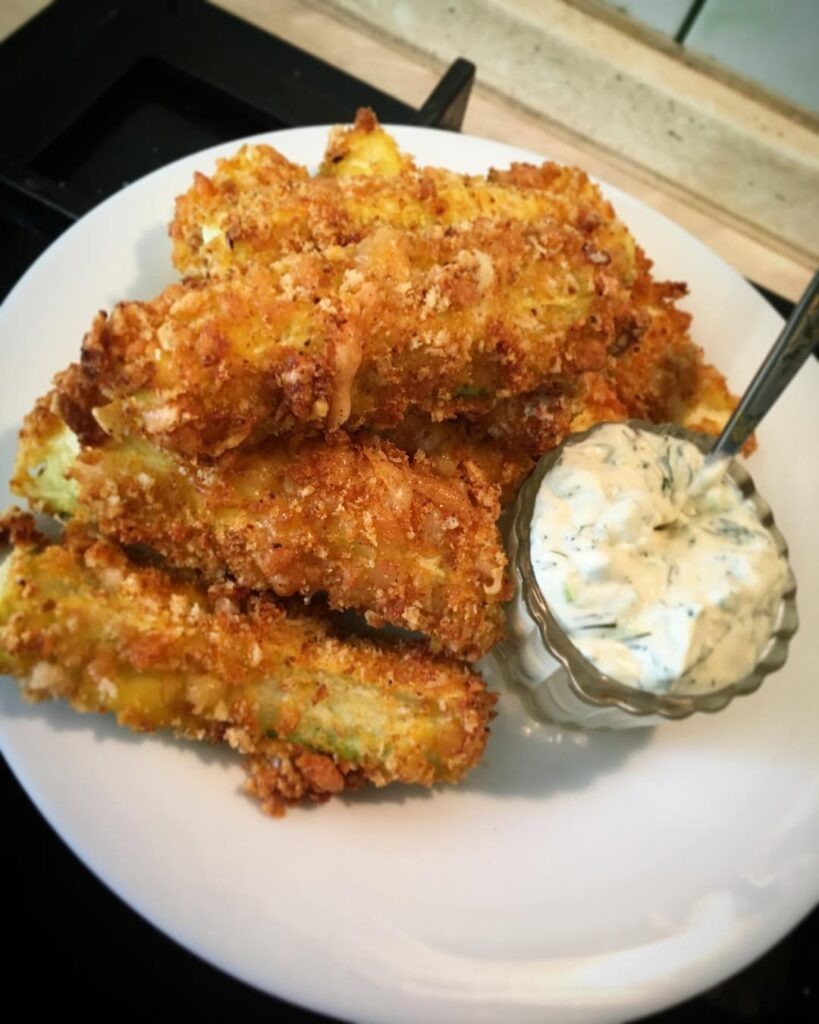 Ингредиенты: 2 свежих кабачка, 2 яйца, 150 г твердого сыра, 8 ст. ложек панировочных сухарей, 3 ст. ложки муки, соль и перец по вкусу, 200 г сметаны, 2 зубчика чеснока, зелень по желанию.