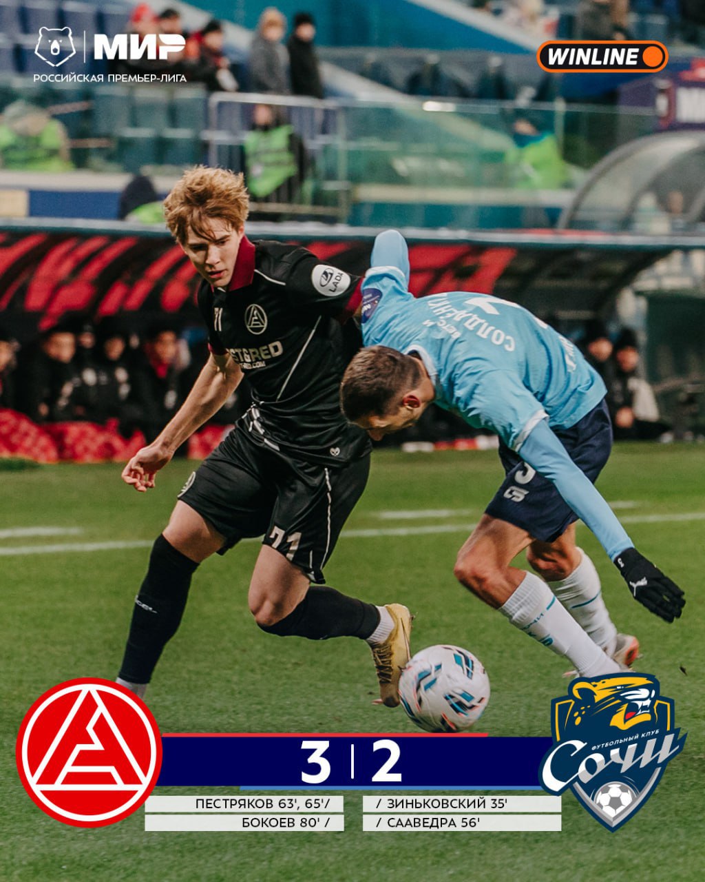 Футболисты тольяттинского «Акрона» обыграли «Сочи» со счетом 3:2 в домашнем матче 16-го тура Российской премьер-лиги (РПЛ).