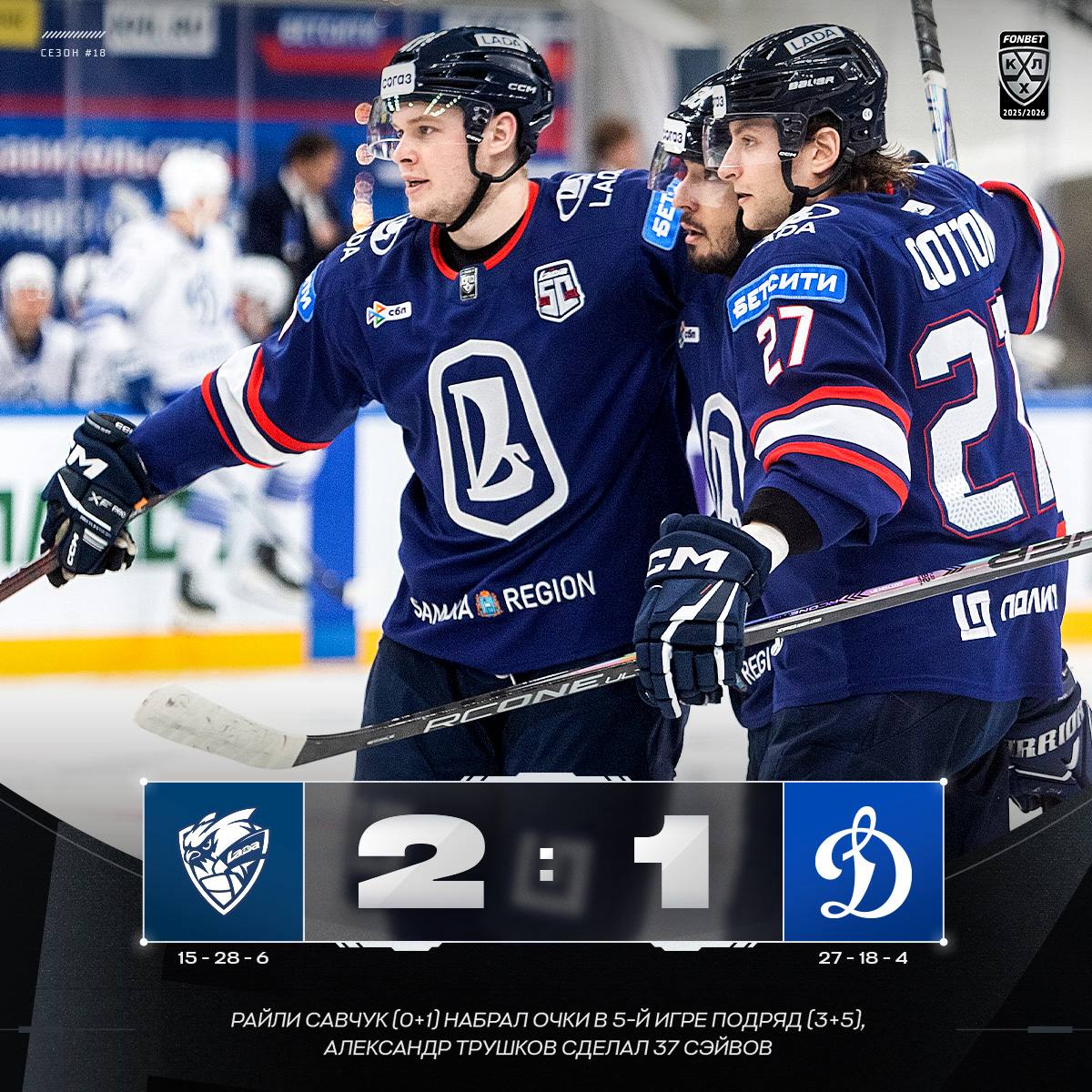 Тольяттинская «Лада» обыграла московское «Динамо» в матче регулярного чемпионата «Фонбет» — КХЛ.